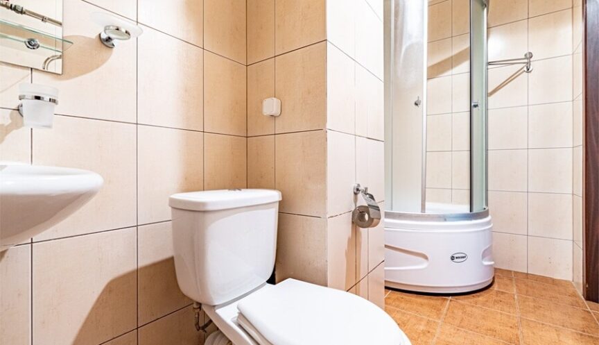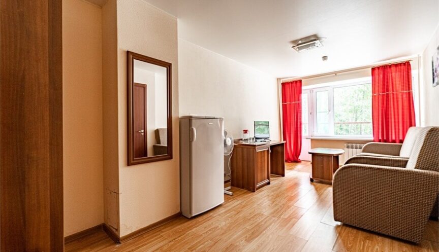 В номере расположены спальня и гостиная. В спальне находятся две односпальные кровати и тумбочки. Гостиная оборудована диваном, шкафом, холодильником и телевизором. Санузел включает ванну, туалет и умывальник.
