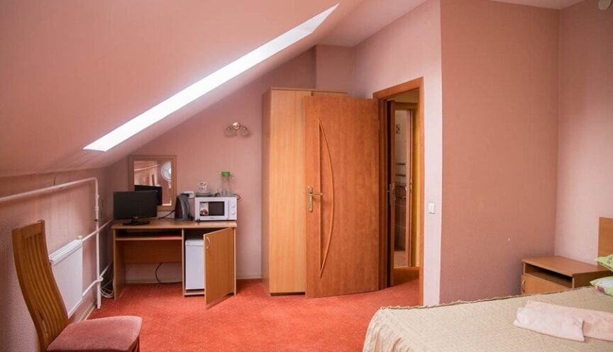 Номер представляет собой 1-комнатное помещение, расположенное в мансарде. В номере предусмотрено два основных места для размещения гостей. Дополнительное место можно организовать с помощью еврораскладушки.
