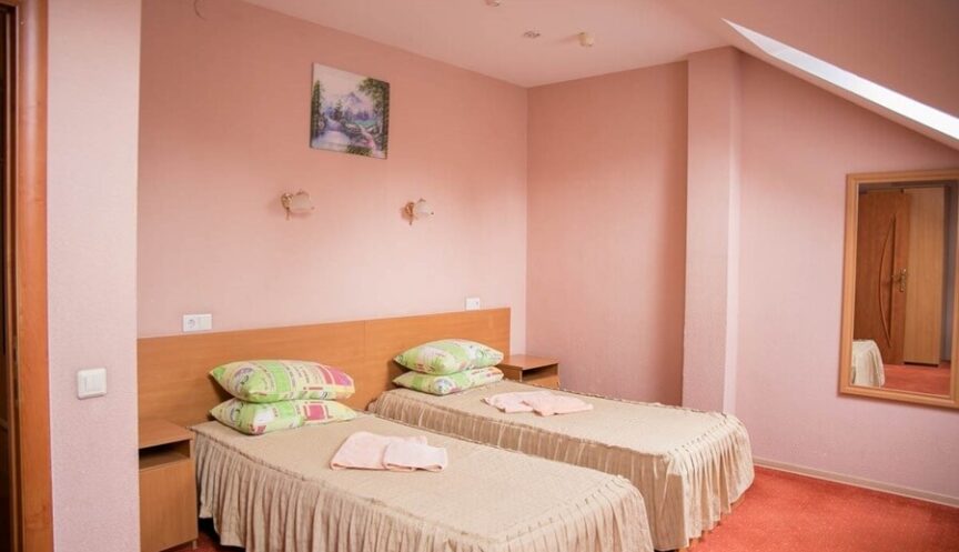 В номере есть необходимая мебель: односпальные кровати, прикроватные тумбочки, стол, стул и шкаф. Также имеется всё необходимое оборудование: микроволновая печь, телевизор, холодильник и электрочайник. Санузел оборудован ванной. Из номера открывается вид на двор.